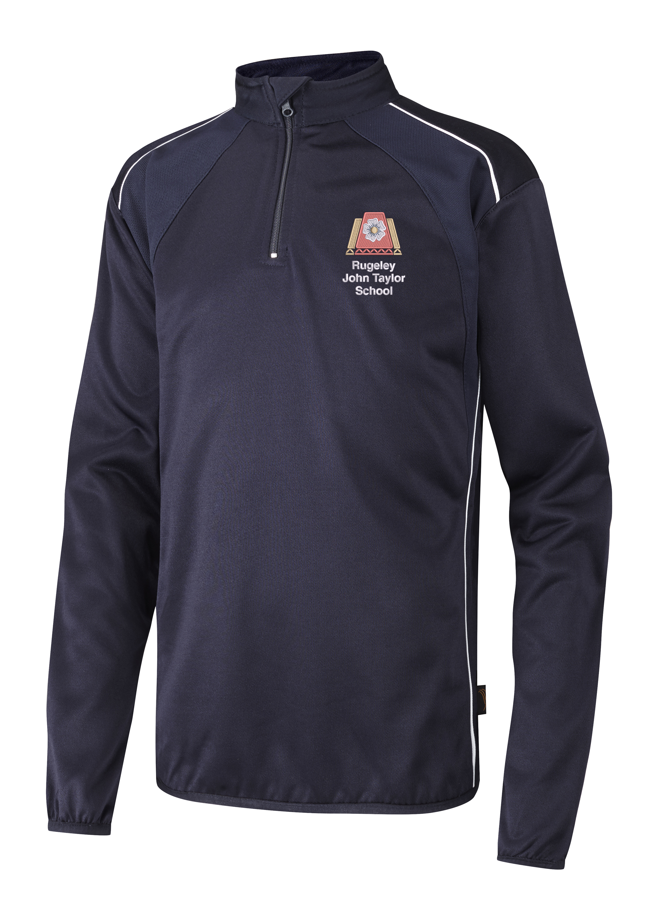 Rugeley John Taylor School 1/4 zip top in Navy/White.